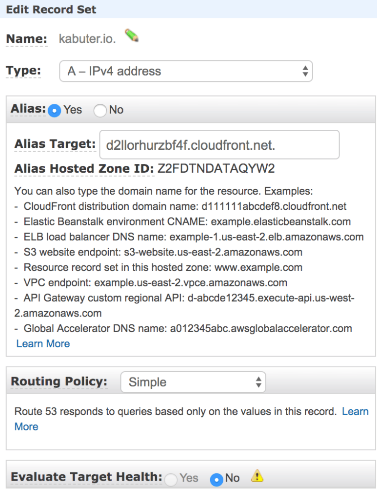 STEP 3: Then use the Domain Name from the created CloudFront distribution and point your Route 53 APEX domain (kabuter.io) as IP4 Alias to the Domain Name